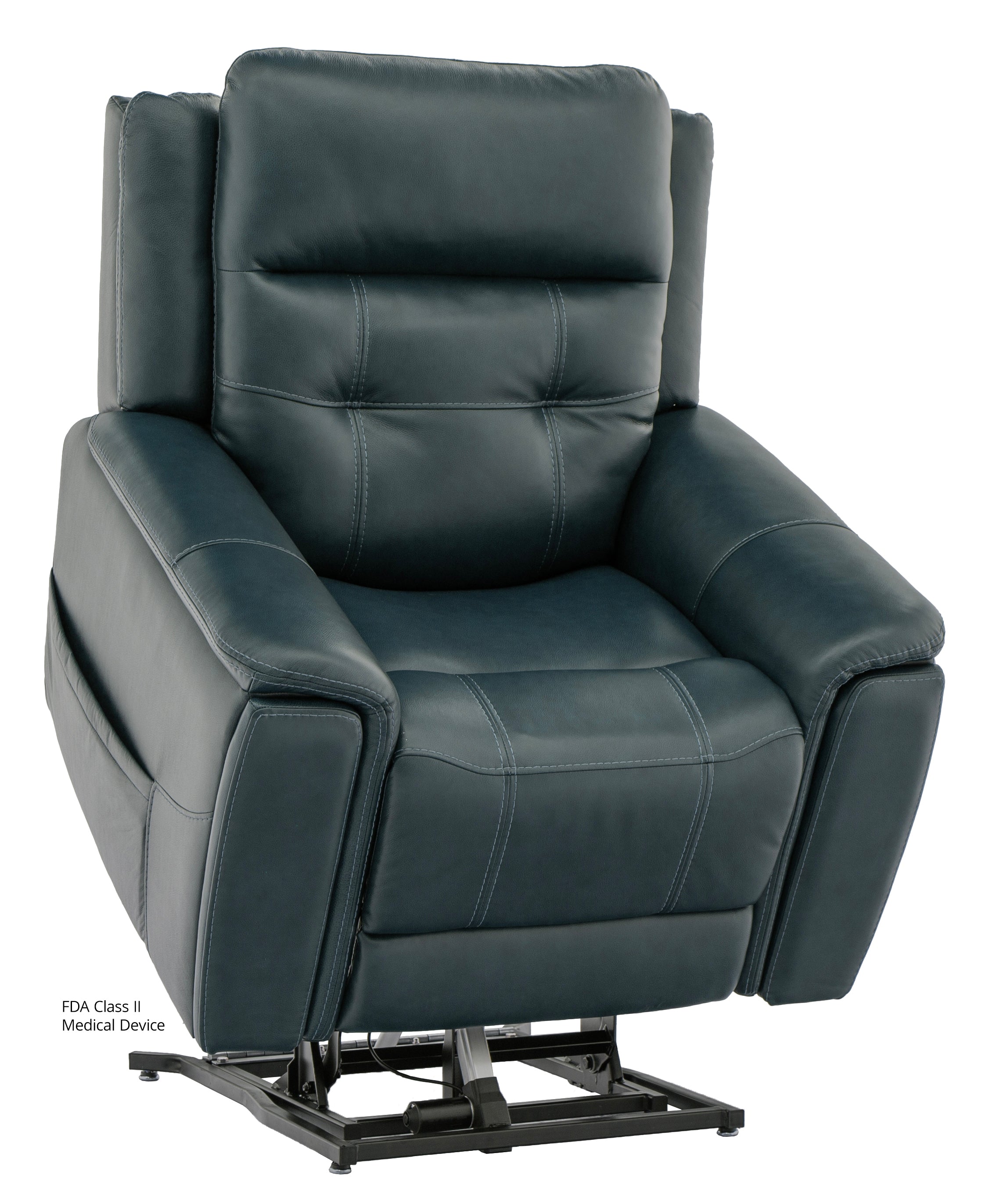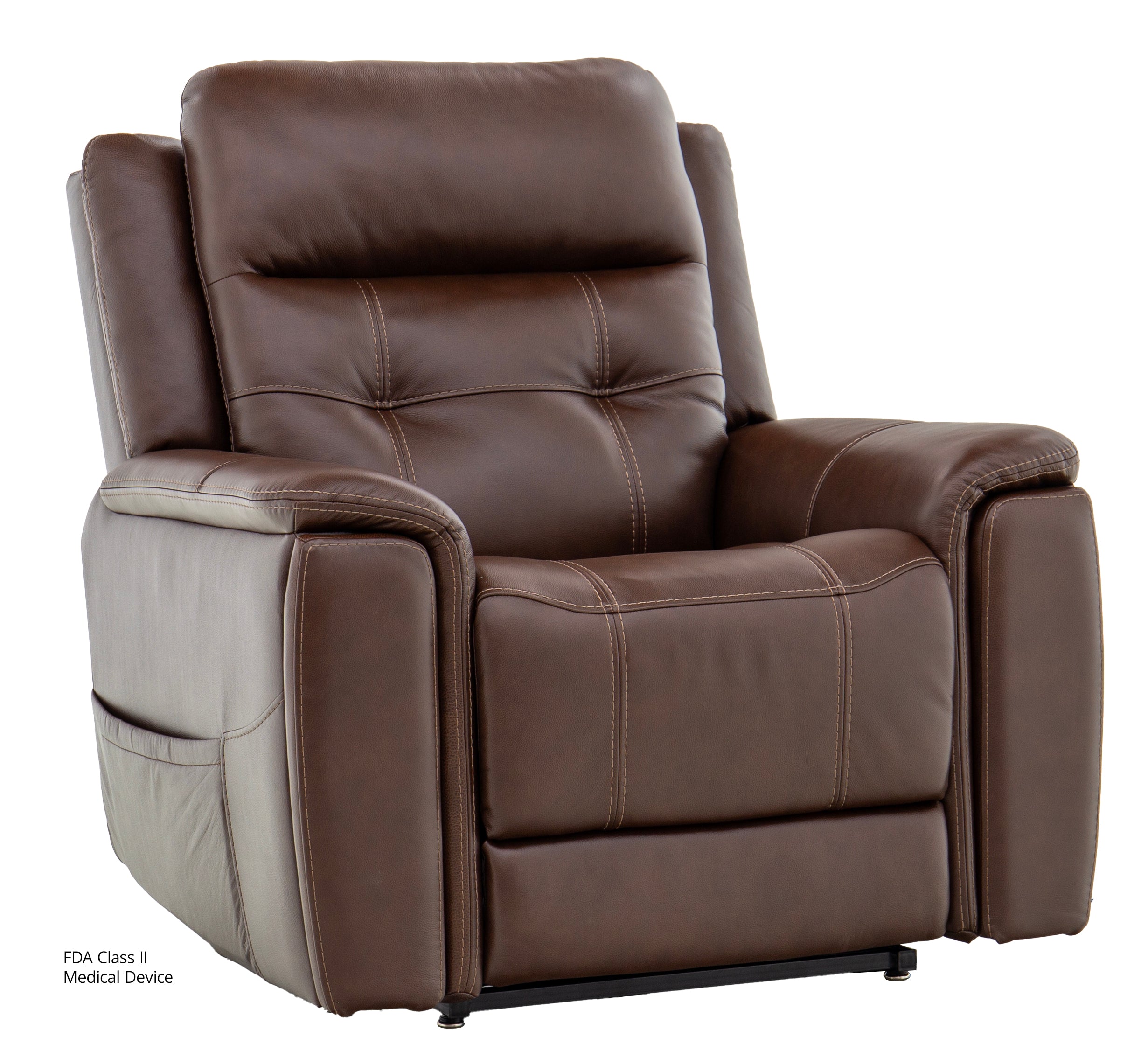 Experience unparalleled comfort with the Mega Motion MM-3975, our first 100% top grain leather chair approved for FDA Class II power reclining lift chairs. The top grain leather covers the seat, back, and arms, while the back and sides feature a matching polyurethane fabric. Our innovative tilt function provides a zero gravity sensation, creating a feeling of weightlessness and serenity. The three-zone heating system soothes achy muscles, and the infinite position capability ensures you find the perfect resting position every time. Adjust the power headrest and power lumbar features to achieve a perfect resting position. FDA Class II Medical Device Shown in Sorrento Coffee, Ocean and Dove.