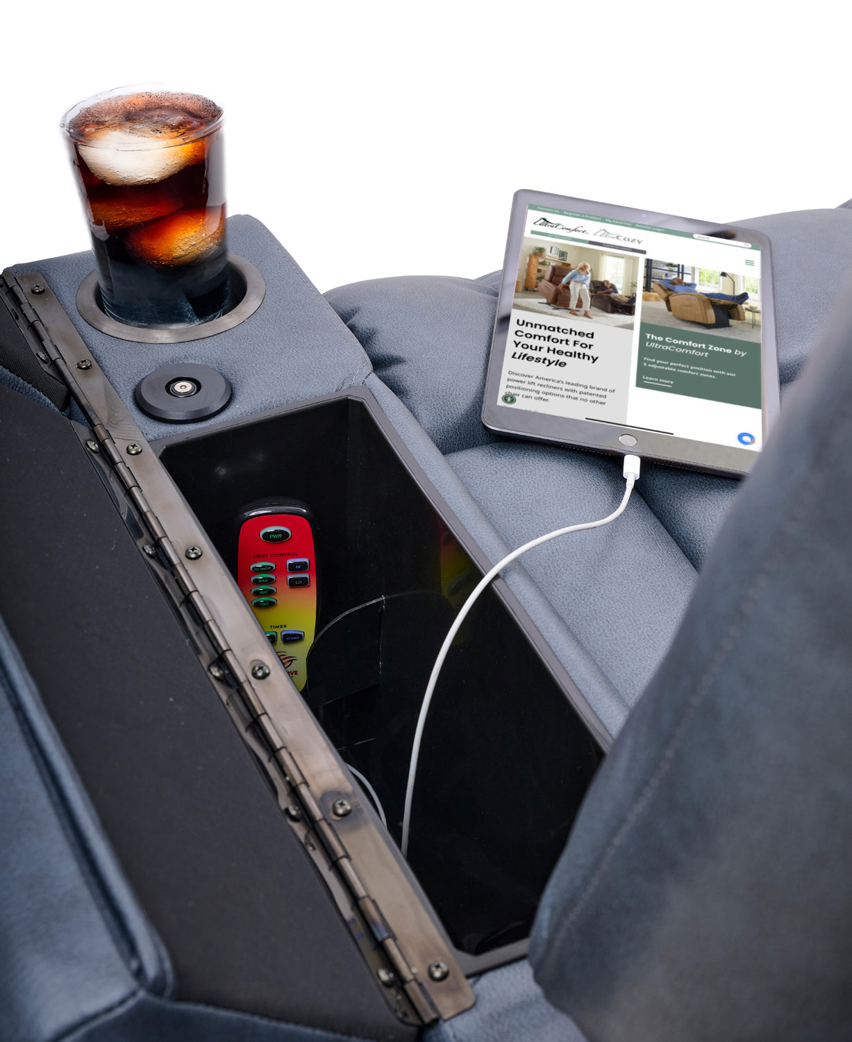 The Ultracomfort Rhodes UC472 features 4-Zone Comfort Zone system that includes our patented Stellar Positioning. Additional features include power adjustable lumbar support, power headrest, an open-arm design, power port with a removeable light and tray table, USB port, wireless charger and far infrared heatwave technology.